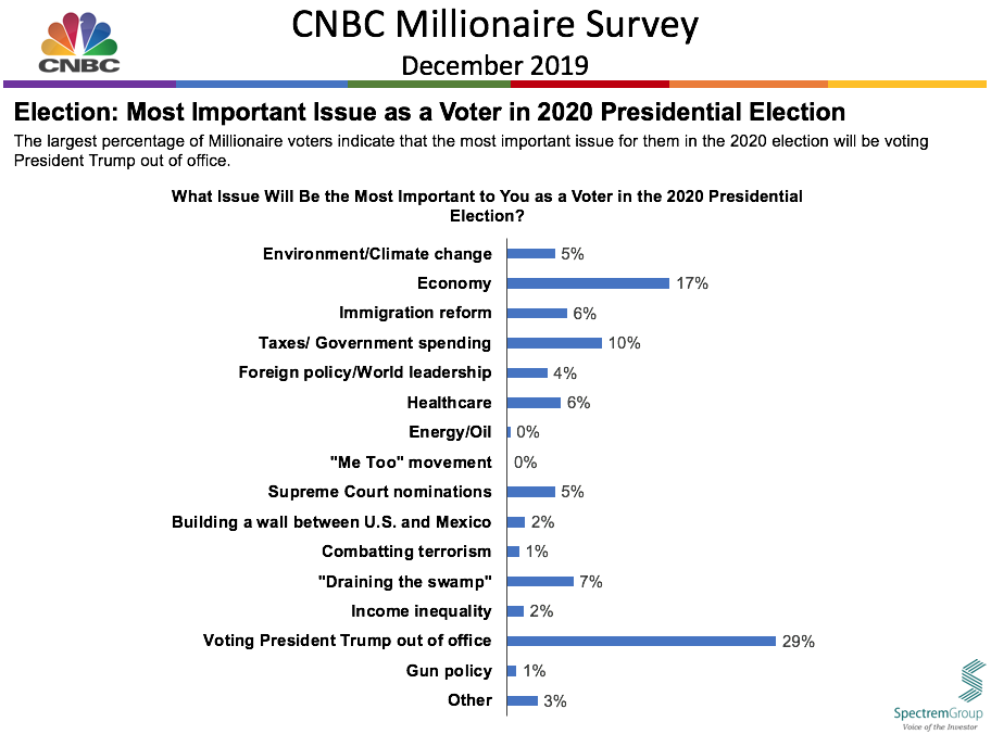 Khi được hỏi ứng cử viên nào họ ủng hộ cho tổng thống vào năm 2020, 36% số triệu phú tên Trump, tăng từ 32% vào tháng 5, theo Khảo sát triệu phú CNBC quý 4. Ứng cử viên được yêu thích thứ hai là cựu Phó Tổng thống Joe Biden, với 14%. Thượng nghị sĩ Elizabeth Warren đứng thứ ba, với 8%. Cuộc khảo sát được thực hiện trước khi Michael Bloomberg tham gia cuộc đua.